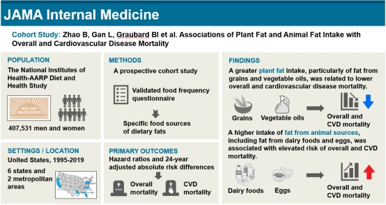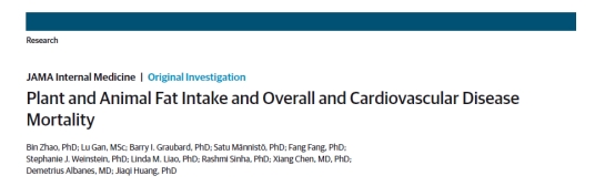 近日,国际顶尖期刊JAMA Internal Medicine(JAMA·内科学)在线发表了永利yl23411三诺营养与代谢健康研究中心/芙蓉实验室黄佳琦、赵斌教授团队题为“Plant and Animal Fat Intake and Overall and Cardiovascular Disease Mortality”的原创性研究论文。本项研究在芙蓉实验室陈翔教授的指导和大力支持下,围绕精准营养与代谢健康,主要阐述了通过宏量营养素-脂肪对慢性病发生发展风险影响,全面评估了不同来源的植物源脂肪、动物源脂肪摄入与心血管疾病死亡和过早死亡显著关联。赵斌教授和博士生甘露为本论文共同第一作者,陈翔教授、Demetrius Albanes教授和黄佳琦教授为共同通讯作者。