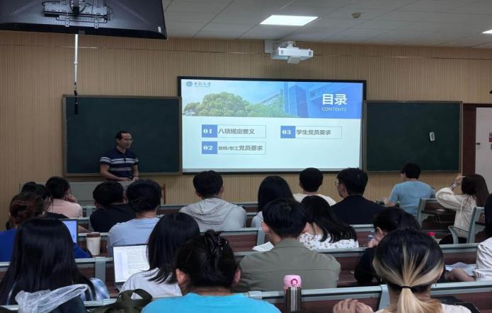 胡国清院长深入解读“中央八项规定”核心要义,强调其是新时代加强党的建设、改进工作作风、密切联系群众的关键举措。他进一步明确了教师职工党员和研究生党员贯彻落实作风建设的任务要求,希望全体党员同志提高政治判断力、领悟力、执行力;严守纪律,接受监督,践行党的宗旨,贡献智慧力量。