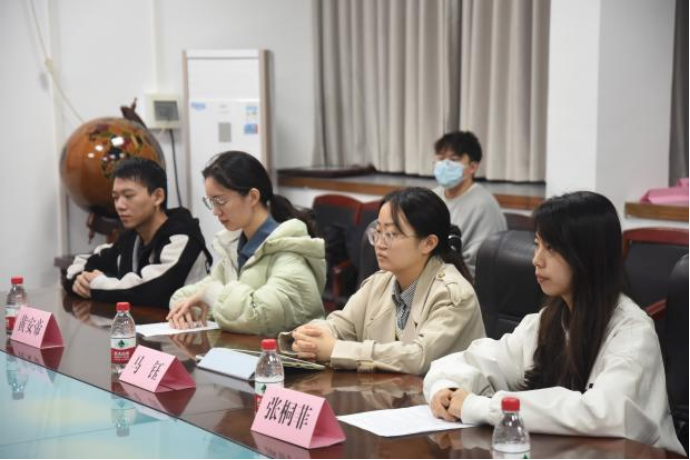 班级学生代表张桐菲、团学干部代表马钰、学生党员代表黄安帝三位同学结合自身情况依次就学习科研、学生工作和入党经历分享成长与收获,同时围绕图书馆和清真食堂建设、实习基地住宿等方面提出中肯的建议。