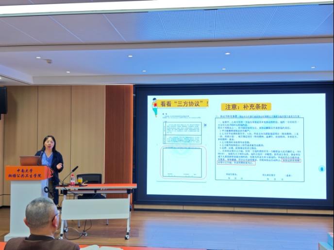 谢沛铭老师首先简单介绍了我院2023届毕业生的去向落实情况,指出我院研究生就业专业性强,本科生升学率高,鼓励同学们认真掌握专业知识,给予了大家就业的信心。接下来,谢沛铭老师分别从如何制作一份优秀的求职简历、网签系统的使用、就业权益政策等三个方面为现场同学进行了详细讲解。在简历制作部分,从简历评分细则出发,结合我院学长学姐的真实简历,详细介绍了标准简历的六大模块;在网签系统部分,分别给毕业生们介绍了电子签约和纸质签约的具体流程和注意事项;在就业权益政策部分,帮助大家详细区分了两方协议和三方协议,并以真实案例呈现毕业生曾在协议签署中踩过的“坑”,带领大家认真解读了协议补充条款的注意事项。讲解深入浅出,干货满满。