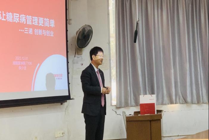 “他山之石,可以攻玉”,李少波特别强调要善于借鉴前人的经验从而获得新的启示。“无论多么奇特、先进的研发成果和新产品,都必须转化为销售额。”“无论多大的销售额,多快的增长,都必须转化为利润。”“无论多大的利润,都必须转化为现金。”这便是李少波要传递给同学们的创业经验和启示。课上,他还为同学们讲述了科技创新的重要性,他从围棋机器人说起,说到古今社会所不同的根本原因,生动剖析了数字化和科技发展对于当今社会发展的重要性,他也为同学们展示了三诺的测血糖技术——可以与手机实现数字化实时连接。