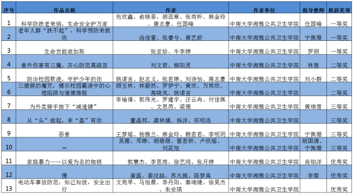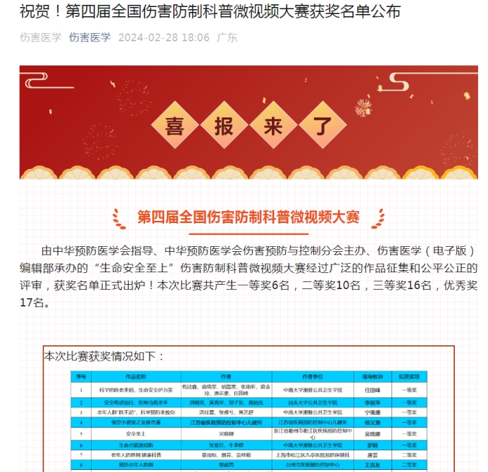 2月28日,由中华预防医学会指导、中华预防医学会伤害预防与控制分会主办、伤害医学(电子版)编辑部承办的“生命安全至上”第四届全国伤害防制科普微视频大赛经过广泛的作品征集和系列评审,获奖名单正式出炉!本次比赛共产生一等奖6名,二等奖10名,三等奖16名,优秀奖17名。永利yl23411永利yl23411师生共斩获奖项13项,其中一等奖3项、二等奖3项、三等奖4项和优秀奖3项。