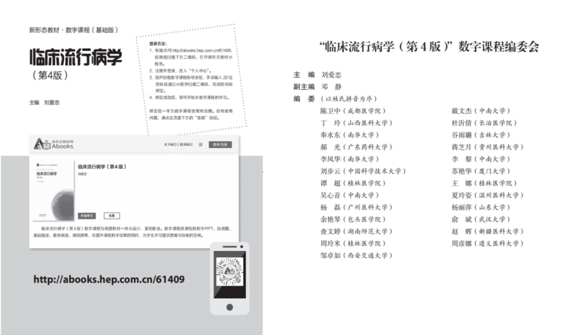 相较于刘爱忠教授主编的《临床流行病学》(第3版),第4版在广泛征求教学一线有关专家教授及编委的意见后,对部分章节的内容进行了调整,补充了倾向性评分、列线图、单臂试验、单病例随机对照试验、有向无环图、真实世界研究、临床大数据应用、临床注册登记研究等实用性较强的内容。此外,第4版教材配有数字课程,以便于教师备课及学生、读者自学。