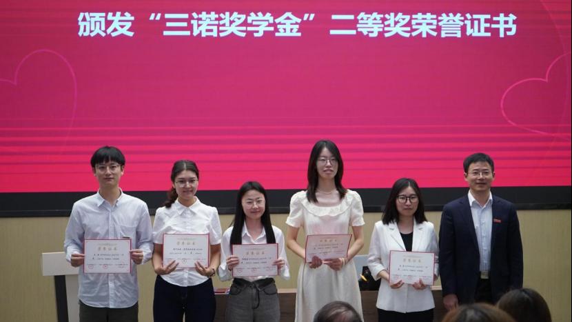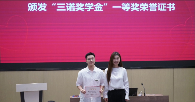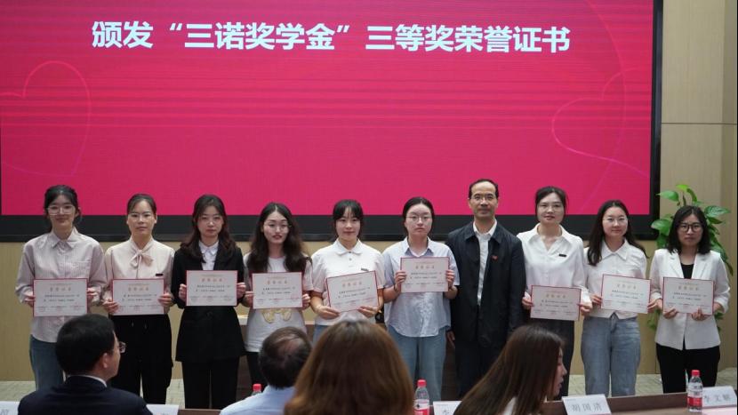 在颁奖典礼上,永利yl23411党委副书记王超宣读了“关于授予韦杰桦等同学永利yl23411永利yl234112023-2024学年三诺奖学金的决定”。李心一理事长、雷先阳书记、胡国清院长分别为2024年“三诺奖学金”一等奖、二等奖、三等奖获得者颁发了荣誉证书。韦杰桦、热汗姑丽·买买提土尔逊两位同学作为获奖学生代表,依次分享了自己研究生期间的科研成果和心得体会。刘宪军秘书长在致辞中对三诺生物传感股份有限公司、湖南省三诺糖尿病公益基金会、以及李少波校友、李心一女士长期以来对母校的关心和支持表示衷心感谢;李心一理事长对获奖学生表示祝贺,鼓励他们不忘初心,再接再厉,她以“融爱于生活,融爱于工作”为题发表了热情洋溢的讲话,结合公司“为爱而诺”的企业文化,为同学们今后的职业发展提出了中肯建议,希望同学们在今后的发展中将爱融入生活、将爱融入工作。