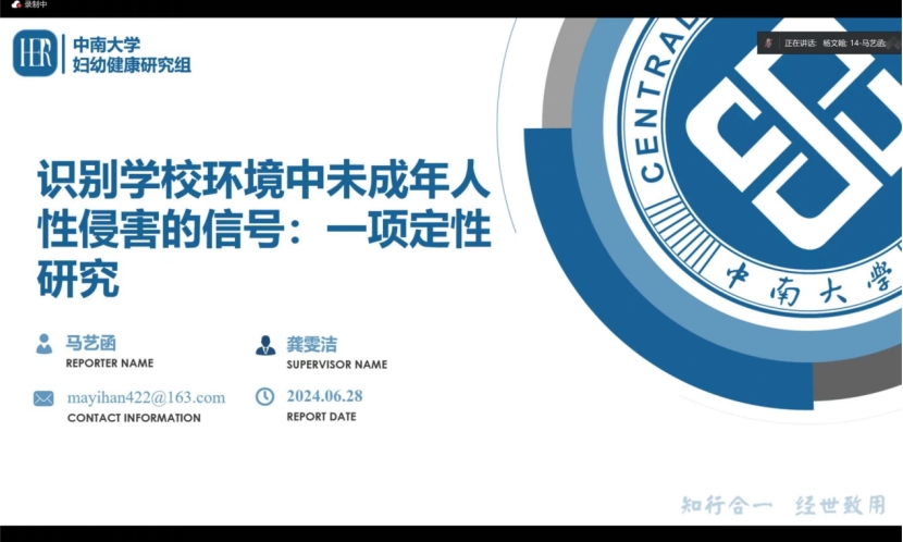 据悉,本次会议邀请了国内外儿童青少年健康领域知名专家和青年学者作学术报告,同时甄选了优秀研究生进行课题汇报,一起分享最新的研究成果和进展。永利yl23411儿少系龚雯洁教授在儿童青少年心理健康专题中作《未成年人性侵害强制报告制度在学校实施的障碍分析》报告,指出当前我国中小学教职员工执行性侵害强制报告的情况并不理想,他们在如何辨识性侵行为、何时报告、如何进行上报等方面存在理解模糊,而当前制度的责任界限不清晰、指导不明确也增加了实施的障碍,制定适宜学校的实施细则可能是减少漏报和错报的关键。HER Team博士研究生马艺函在博士生线上专题以《识别学校环境中未成年人性侵害的信号:一项定性研究》为主题,围绕中国学校环境中是否存在未成年人性侵害的监测信号展开探讨,提出中小学班主任对哪些是关键监测信号以及每种信号的重要性存在分歧,需要进一步总结现有的监测模式,并制定相应措施指导学校实施有效的性侵害监测机制。