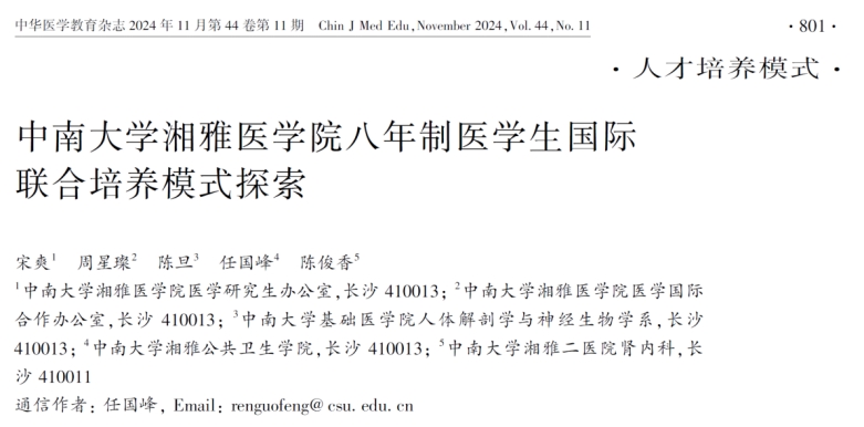 近日,我校医学生国际联合培养的最新教育教学研究成果“永利yl23411湘雅医学院八年制医学生国际联合培养模式探索”一文在《中华医学教育杂志》2024年11期作为第一篇文章发表,湘雅医学院研究生办宋爽老师为第一作者,我院任国峰老师是论文的通讯作者。