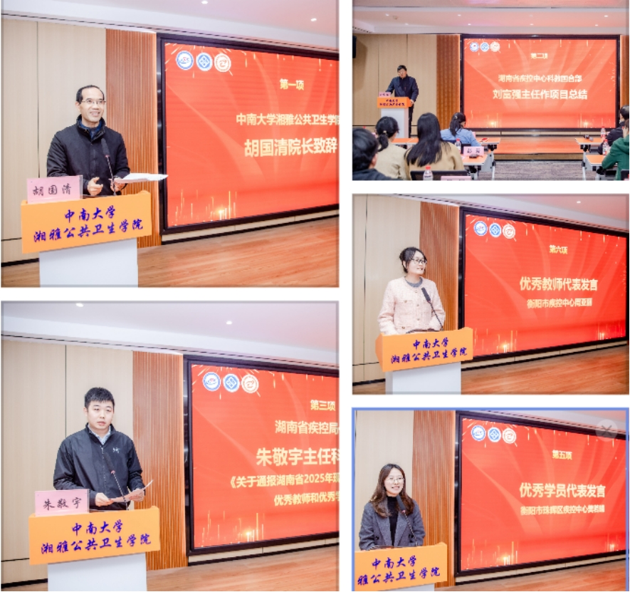 胡国清在致辞中,首先向顺利完成学业的学员们致以热烈祝贺,随后回顾了学院在依托优质师资与教学平台,圆满完成的3次集中理论教学任务,从公共卫生监测原理到SPSS、ArcGIS软件实操,从VR虚拟仿真应急演练到科研论文写作指导,全程以“实战导向”为核心,为学员构建系统的知识体系。胡国清强调,现场流行病学是“守护健康的前沿学科”,期许学员们将课堂所学转化为基层实践的“真功夫”,在公共卫生一线彰显专业价值。