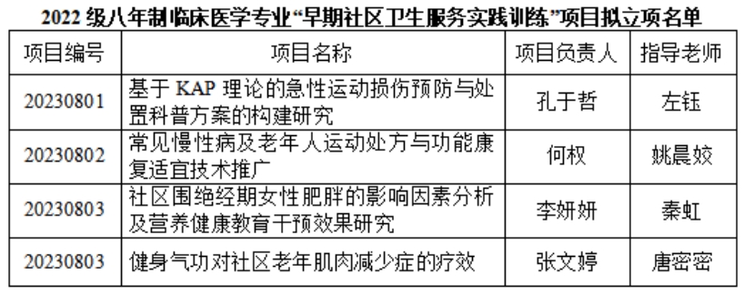 按照《关于2022级八年制临床医学专业“早期社区卫生服务实践训练”项目立项申报的通知》要求,永利yl23411业务办公室组织实施了2022级八年制临床医学专业“早期社区卫生服务实践训练”项目立项评审工作。经个人申请、形式审查、学院评审,拟确定2022级八年制临床医学专业“早期社区卫生服务实践训练”项目立项4项,现将名单进公示。公示期:2023年8月23日至8月25日。