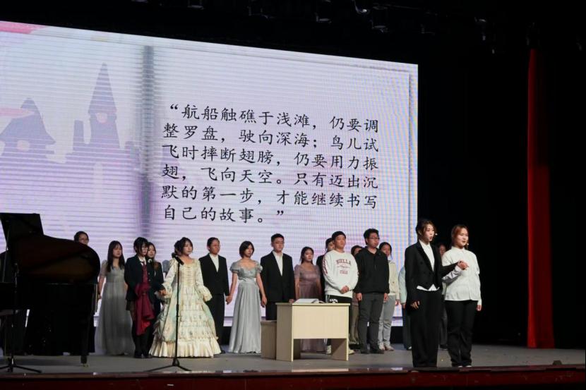 剧目《語》聚焦戏剧社新生陈默的内心世界。她因口吃困扰,在自我对话中投射出一个积极人格——“知语”。全剧通过面试、角色争夺、排练筹备等层层递进的戏剧冲突,生动呈现了两个“自我”在面临挑战时的不同抉择与成长路径。在“知语”的不断鼓励与推动下,陈默逐渐突破表达障碍,最终在正式演出中完美诠释角色,完成了从“沉默”到“勇敢发声”的动人蜕变。作品紧扣“沉默者亦知语”的深刻主题,阐释了:即便前路困难重重,只要心怀自信与坚定,每个人都能在生命的舞台上绽放独一无二的光芒。