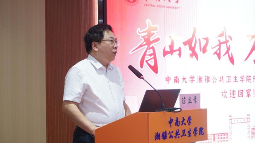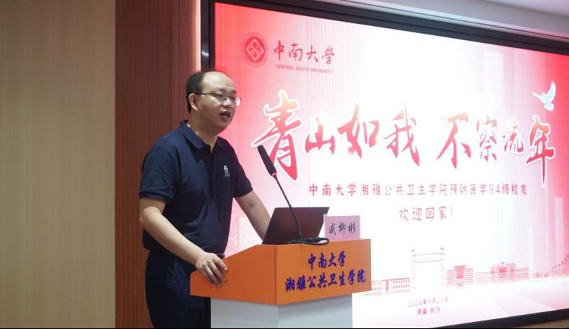 94级校友、国家药品监督管理局戚柳彬副司长代表校友们发言,表达了对母校培养的感激之情,并对学院取得的成绩感到由衷的自豪。他回忆起在校求学的美好时光,表示“公勇勤慎、诚爱谦廉、求真求确、必邃必专”的湘雅精神是母校留给自己的宝贵财富,是激励自己一路前行的最大动力。